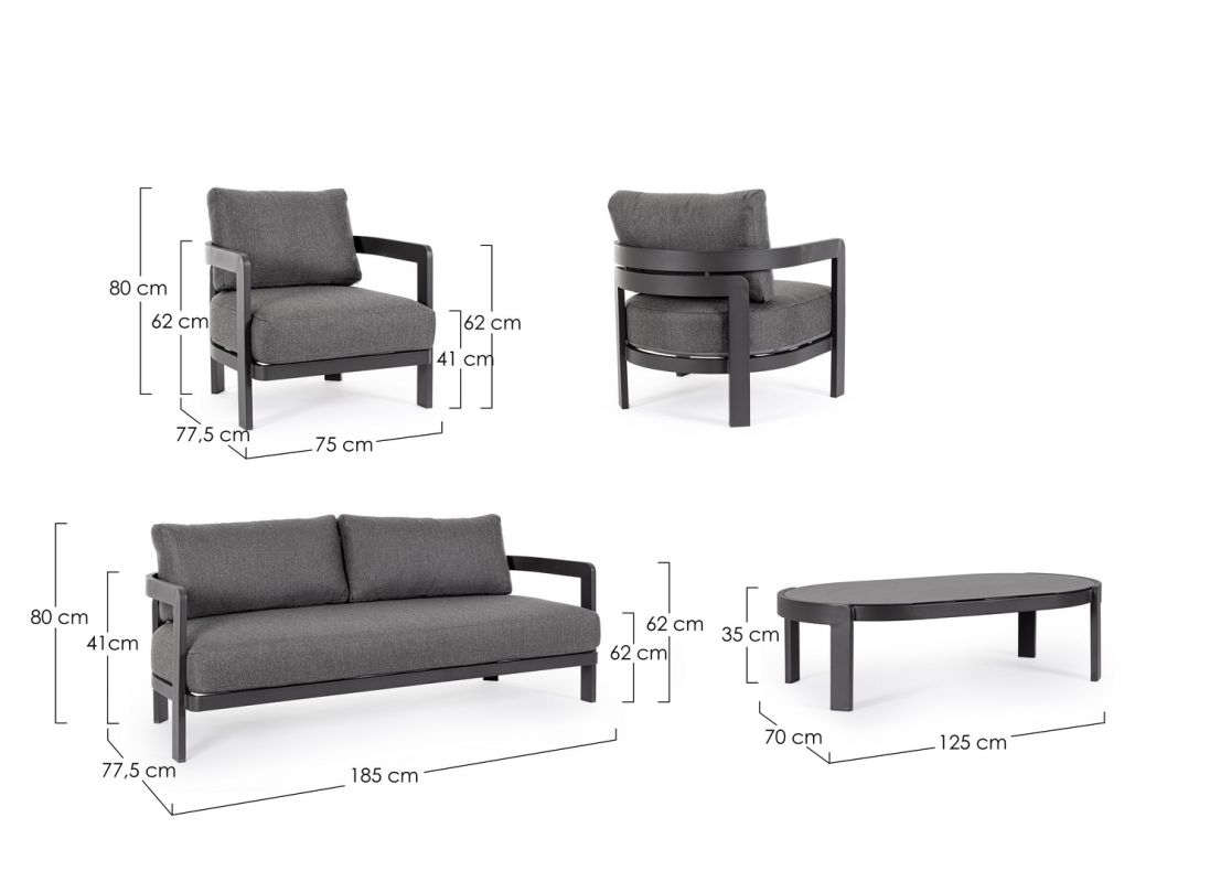 STRUTTURA IN ALLUMINIO VERNICIATO A POLVERE (POLIESTERE). CUSCINI SEDUTA E SCHIENALE SFODERABILI IN TESSUTO IDROREPELLENTE OLEFIN (100% POLIPROPILENE). TAVOLINO CON PIANO IN VETRO STAMPATO.