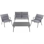 Salotto da esterno in acciaio  composto da divano 2 posti due poltrone  e tavolino cuscineria idrorepellente ad agiugatura rapida.